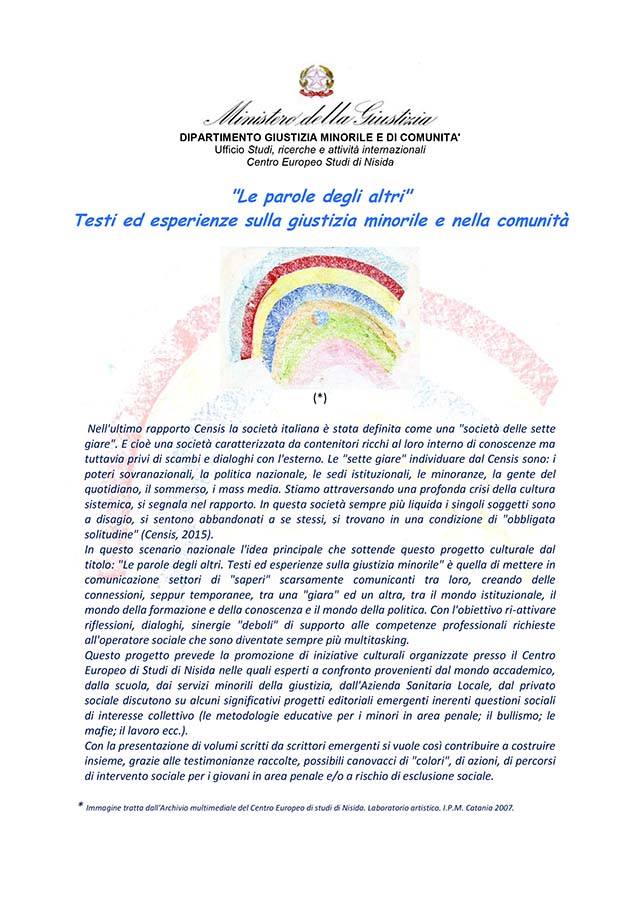 “Le parole degli altri”, testi ed esperienze sulla giustizia minorile e nella comunità. L’idea principale che sottende questo progetto culturale è quella di mettere in comunicazione settori di “saperi” scarsamente comunicanti tra loro, creando delle connessioni, seppur temporanee, tra una “giara” ed un altra, tra il mondo istituzionale, il mondo della formazione e della conoscenza e il mondo della politica. Con l’obiettivo ri-attivare riflessioni, dialoghi, sinergie “deboli” di supporto alle competenze professionali richieste all’operatore sociale che sono diventate sempre più multitasking. Questo progetto prevede la promozione di iniziative culturali organizzate presso il Centro Europeo di Studi di Nisida nelle quali esperti a confronto provenienti dal mondo accademico, dalla scuola, dai servizi minorili della giustizia, dall’Azienda Sanitaria Locale, dal privato sociale discutono su alcuni significativi progetti editoriali emergenti inerenti questioni sociali di interesse collettivo.