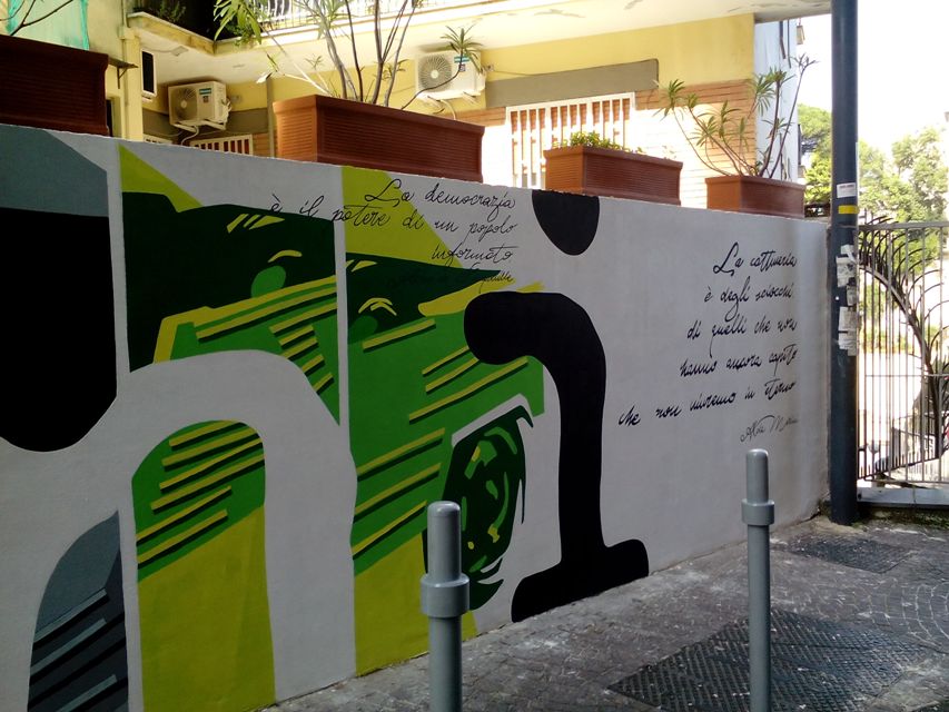 Gli artisti milanesi Orticanoodles hanno dipinto il muro inserendo piccole istantee della vita di Giancarlo, utilizzando il verde come la sua Mehari diventata il simbolo della sua battaglia contro la camorra ed il bianco ed il nero, come la carta stampata del giornale “Il Mattino”. Una macchina da scrivere e tante citazioni celebri che portano fino alle scale mobili della stazione della metropolitana di Salvator Rosa, raffigurate con una nuova tecnica definita “Airlite”, ovvero una vernice naturale che grazie all’energia del sole trasforma gli agenti inquinanti in minerali innocui per l’ambiente. All’inaugurazione dell’opera erano presenti il sindaco di Napoli Luigi De Magistris, il prefetto Pantalone, il presidente dell’Ordine dei Giornalisti della Campania Ottavio Lucarelli e tanti altri tra parenti, colleghi ed amici del cronista partenopeo. Per un Giancarlo Siani che muore però, ci sono altri migliaia di giornalisti che vengono letteralmente scamazzati dal sistema editoriale italiano senza tutele e diritti, schiavi di un modo di fare informazione che non premia le qualità di chi si impegna nel raccontare la città.