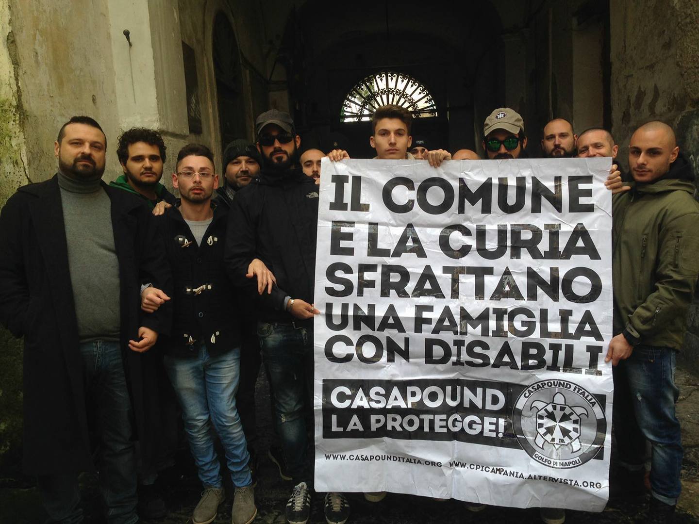Da quanto si apprende dalla pagina facebook di ‘Casapound Italia golfo di Napoli’ questa mattina un nucleo di attivisti di ispirazione fascista erano ad Ercolano per protestare contro lo sfratto della famiglia Liberti, che risiedeva abusivamente nei locali dell’edificio ‘Gemma dell’aquila’ di Ercolano.