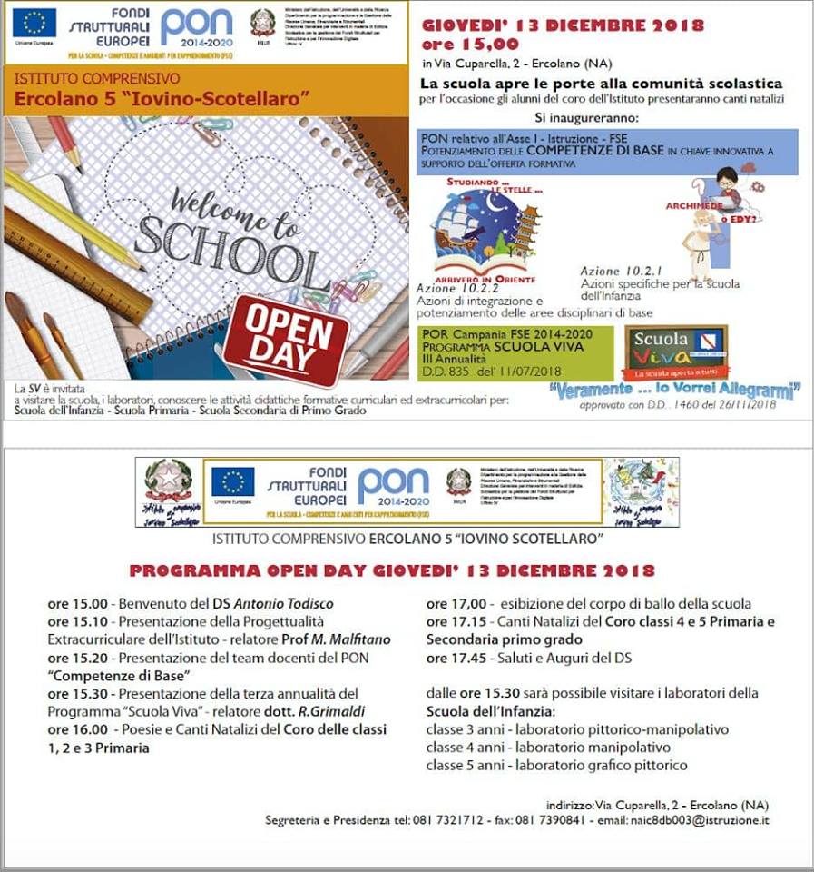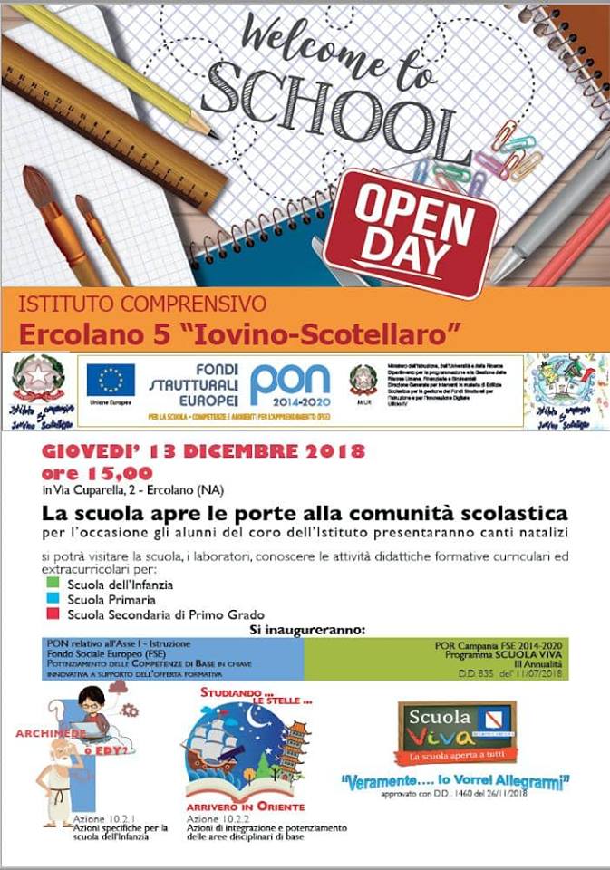 Il prossimo giovedì 13 dicembre, alle ore 15.00 ci sarà l’Open Day dell’Istituto comprensivo Ercolano 5 “Iovino Scotellaro”.