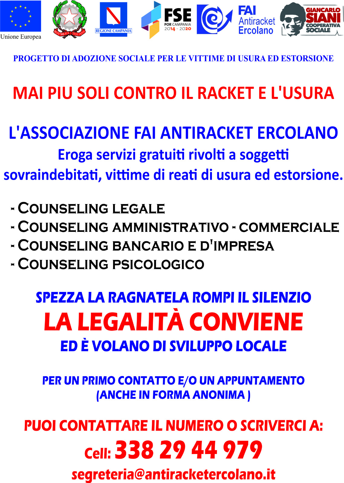 Grazie alla volontà politica della Regione Campania e dell’Assessorato alle Politiche integrate di sicurezza e legalità, presieduto dal Dott. Franco Roberti, già Procuratore Nazionale Antimafia, l’Associazione FAI Antiracket Ercolano, beneficiaria del bando pubblico “Progetti di adozione sociale per le vittime di usura ed estorsione – seconda edizione – P.O.R. Campania FSE 2014-2020 – Obiettivo Specifico 11 – Azione 9.6.2”, offrirà in maniera ancora più efficace e capillare servizi di Presa in carico, Counseling legale, Counseling amministrativo/commerciale, Counseling bancario e d’impresa, Counseling psicologico.
