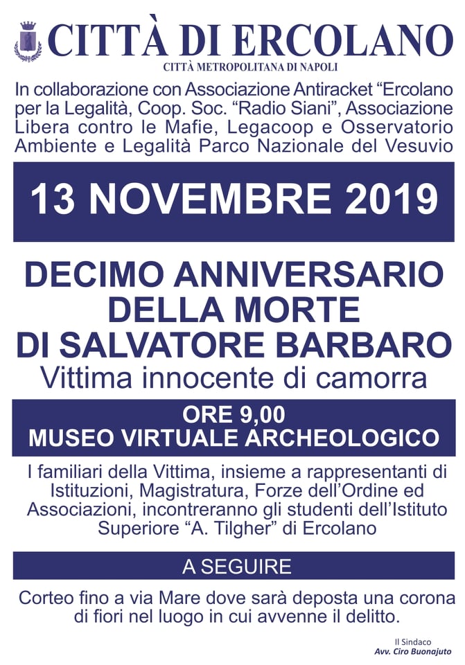 Si terrà mercoledì 13 novembre la cerimonia per commemorare Salvatore Barbaro, un giovane di Ercolano ucciso in via Mare nel 2009 perché scambiato dai killer per un boss della locale criminalità organizzata.