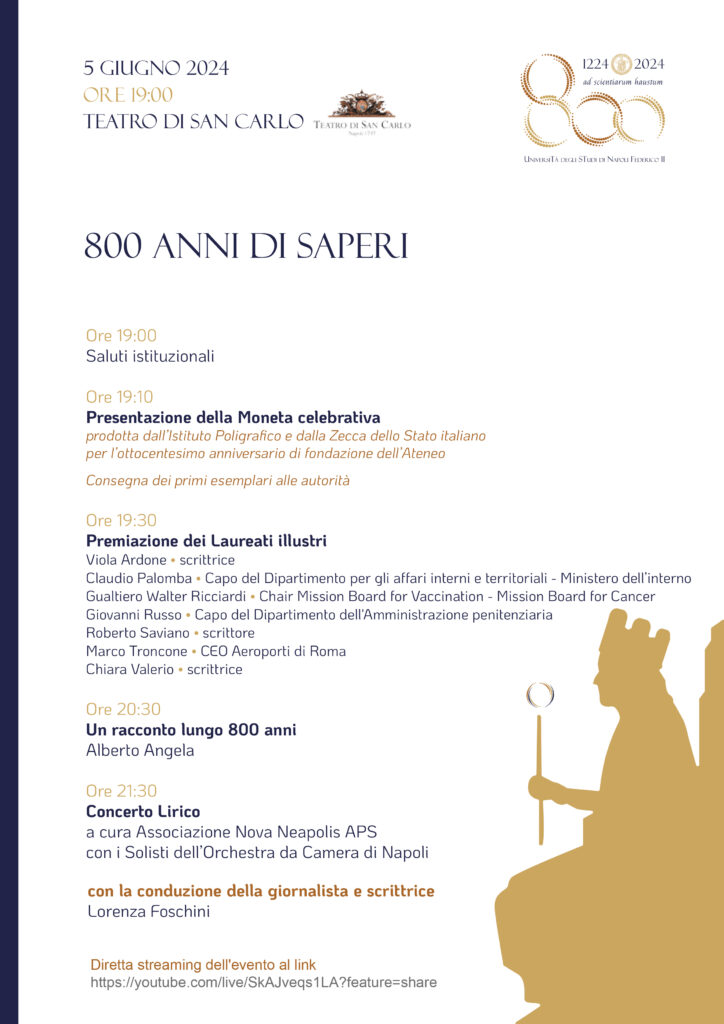800 Anni di Saperi, appuntamento che ha visto protagonisti le eccellenze di ieri e di oggi dell’Ateneo Federico II di Napoli. Le celebrazioni degli ottocento anni di storia dell’Università Federiciana, hanno visto un fitto calendario di appuntamenti, nella illustre serata del massimo partenopeo, protagonisti istituzionali e personaggi del mondo culturale si sono susseguiti sul palco del Teatro San Carlo di Napoli. Tra le tante figure: Roberto Saviano, Viola Ardone, Claudio Palomba, Matteo Lorito, Chiara Valerio, Walter Ricciardi, Michele Di Bari, Gaetano Manfredi, Vincenzo De Luca.