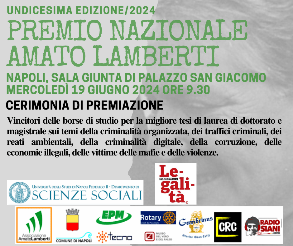 La premiazione avverrà mercoledì 19 giugno 2024 alle ore 9.30 presso la Sala Giunta di Palazzo San Giacomo e interverranno: il sindaco di Napoli Gaetano Manfredi, il professore Nando dalla Chiesa, docente e presidente di SISMA, Società scientifica Italiana degli Studi su Mafie e Antimafia, il giornalista e scrittore Gigi Di Fiore, la cronista e scrittrice Marilena Natale, il Presidente onorario del Premio Nazionale ‘Amato Lamberti’, Franco Roberti.