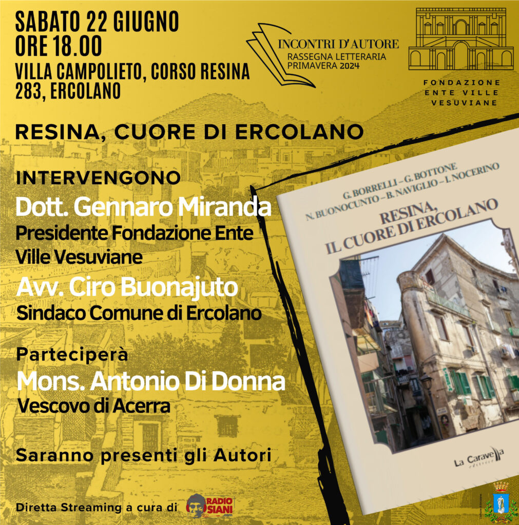 Il prossimo 22 giugno, nell’ambito della rassegna “Incontri d’Autore” della Fondazione Ente Ville Vesuviane, l’appuntamento è con la presentazione del volume “Resina, Cuore di Ercolano” di Giuseppe Bottone, Gaetano Borrelli, Nicola Buonocunto, Iole Nocerino, Biagio Naviglio.