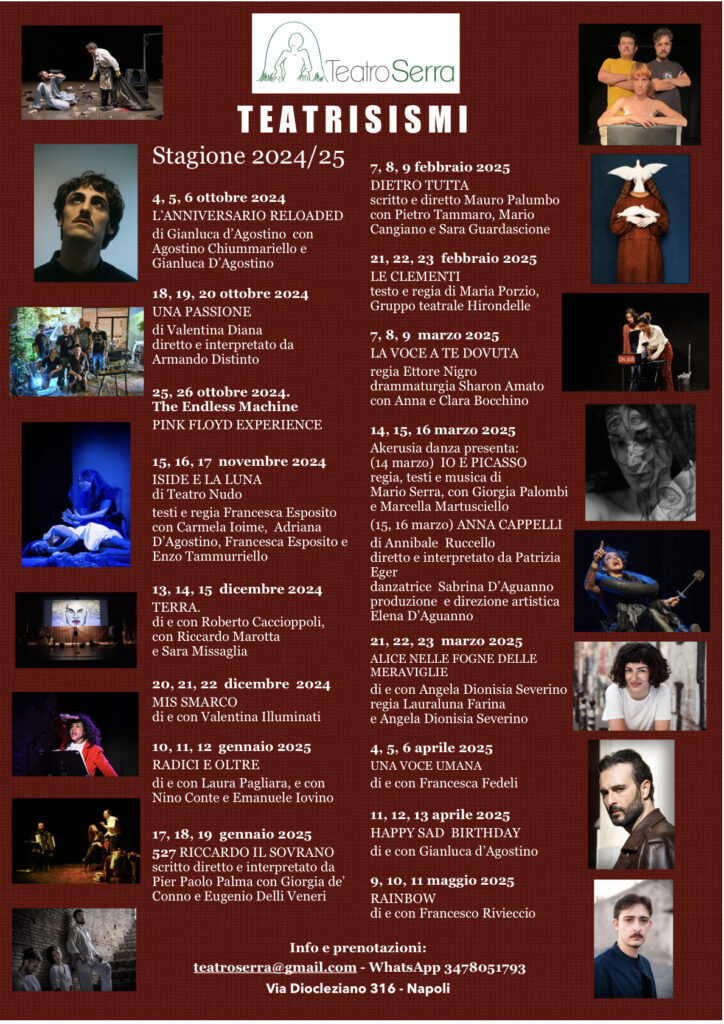 Si partirà  venerdì 4 Ottobre, sino al 6 Ottobre, con “L’anniversario reloaded”, commedia black su gli uomini e la loro difficoltà nel relazionarsi, produzione de “Le false partenze” di e con Gianluca D’Agostino. Da venerdì  20 a domenica 22 in scena il primo degli undici debutti , “ Una passione” di  Valentina Diana. Armando Distinto, attore e regista, si troverà dinanzi ad un intreccio di poesia e coraggio, da solo, nei panni di una comparsa, mescolerà pensieri e sentimento, nel bel mezzo di una replica saltata senza preavviso. “The Endless Machine” porteranno al Teatro Serra il loro spettacolo “The Pink Floyd Experience”, dedicato ad una delle più grandi e leggendarie -rock band. Dal 15 al 17 Novembre,“Iside e la Luna Fluo”, produzione firmata “Teatro Nudo” , con in scena Fracesca Esposito, Carmela Ioime e Adriana D’Agostino, decanterà il mito di Iside, legato alla città di Napoli, in una visione al femminile ma introspettiva Roberto Caccioppoli, Sara Missaglia e Riccardo Marotta, saranno i protagonisti di “Terra”, in scena venerdi 13 Dicembre debutto che vedrà in scena un opera-reality show riflessiva sullo smodato consumo “fast”, all’interno di un contesto completamente apocalittico.