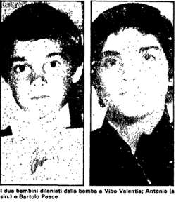 Bortolo e Antonio erano due fratellini che mentre giocavano furono uccisi da una bomba posta per sbaglio davanti alla loro abitazione. L’intimidazione era diretta nei confronti del pregiudicato Giuseppe Strano e dei suoi figli che abitavano a pochi metri di distanza dalla casa dei Pesce.