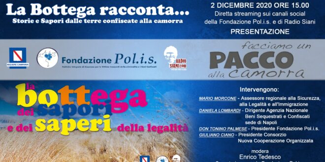 Leggi Tutto »Mercoledì 2 dicembre, alle ore 15.00 la Fondazione Polis della Regione Campania, in collaborazione con la cooperativa sociale Giancarlo Siani, presenta il progetto "Facciamo un pacco alla camorra", realizzato sui terreni confiscati alla criminalità organizzata nel Casertano.