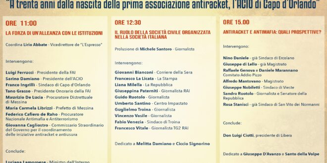 Leggi Tutto »A trenta anni dalla costituzione della prima associazione antiracket, l'ACIO di Capo D'Orlando, un evento online sarà l'occasione per dialogare sul movimento antiracket nella società civile italiana, insieme a don Luigi Ciotti, a rappresentanti del giornalismo, delle istituzioni e della società civile. Sarà presente il Ministro dell'Interno Luciana Lamorgese.