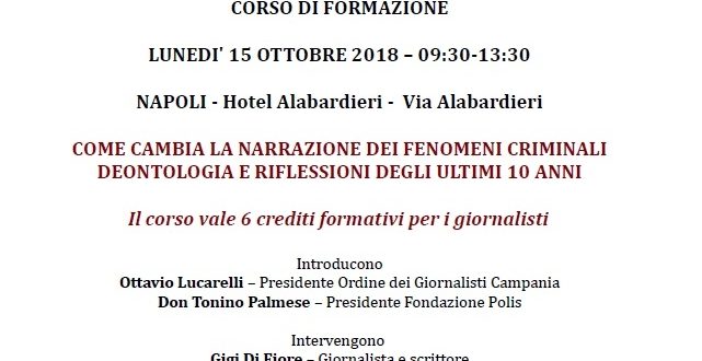 Leggi Tutto »Lunedì 15 ottobre, alle ore 9:30, presso l’Hotel Alabardieri (Napoli, via Alabardieri), si svolge il corso di formazione “Come cambia la narrazione dei fenomeni criminali. Deontologia e riflessioni degli ultimi 10 anni”.